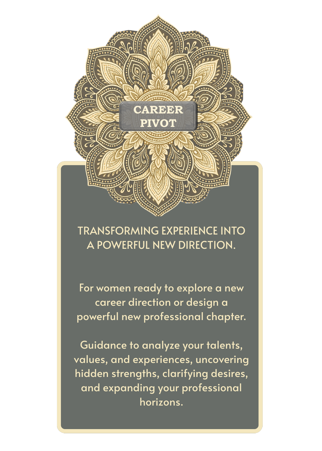 - In-depth skills and strengths assessment, plus desire mapping to guide your next move.